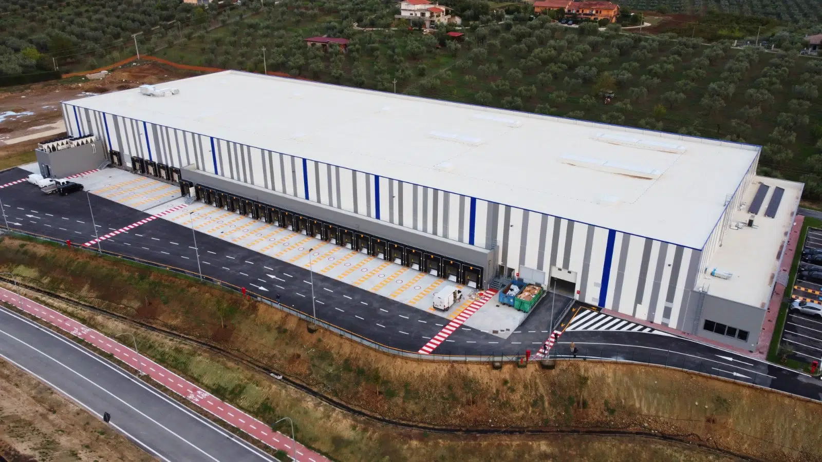 L’edificio si sviluppa su una superficie complessiva di 9.192 mq, di cui 8.685 mq destinati al deposito e 507 mq riservati agli uffici. Il magazzino è servito da 6 piattaforme elettroidrauliche, integrate in un layout che consente l’ottimizzazione dei flussi in ingresso e uscita. All’esterno, l’area parcheggio comprende 40 posti auto, a servizio del personale e degli operatori.